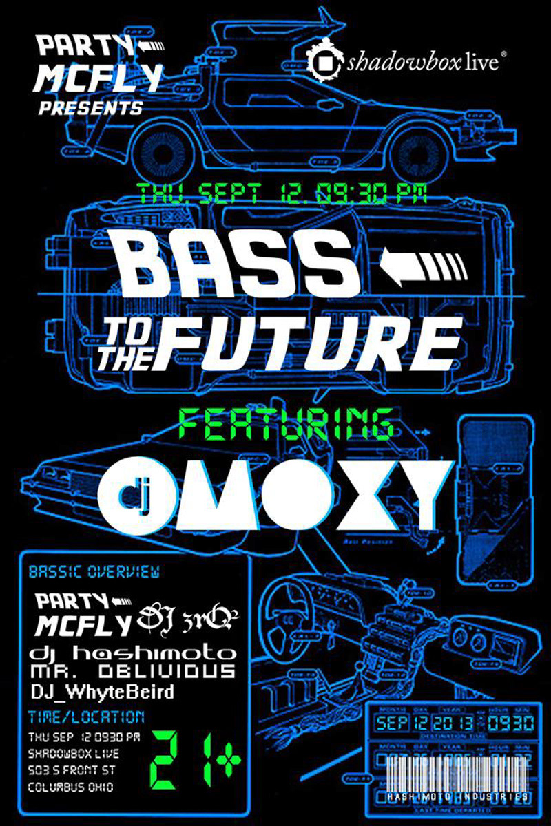 Promotional and event photography and poster design for Bass to the Future, a Hashimoto Industries electronic dance music event. September 2013.